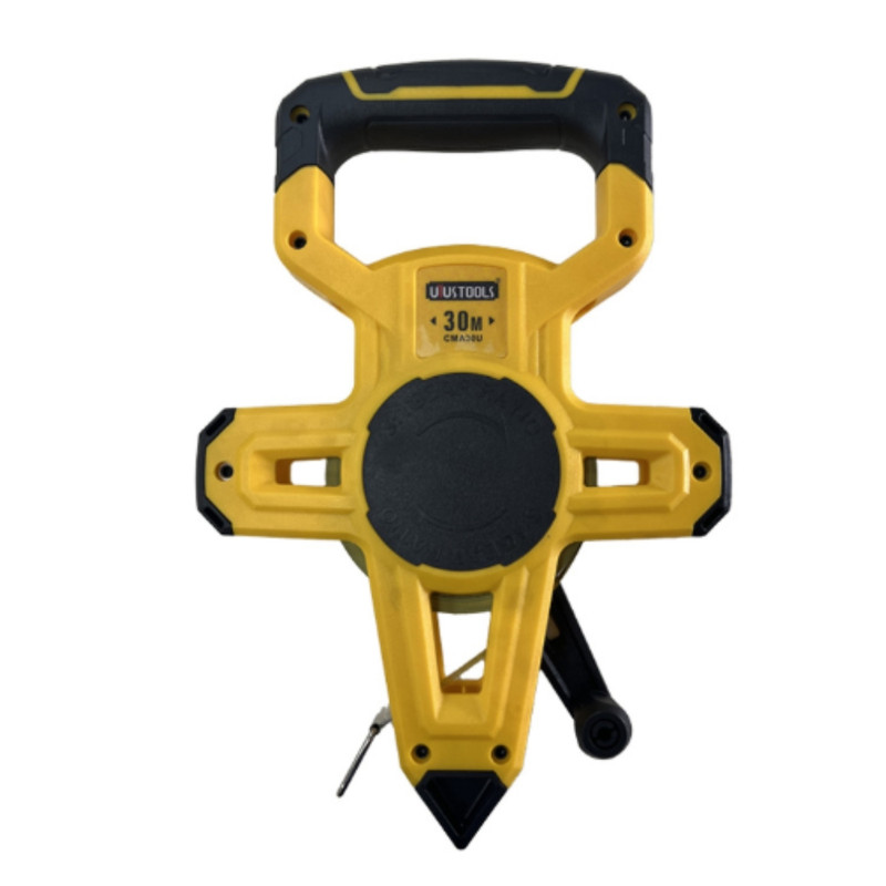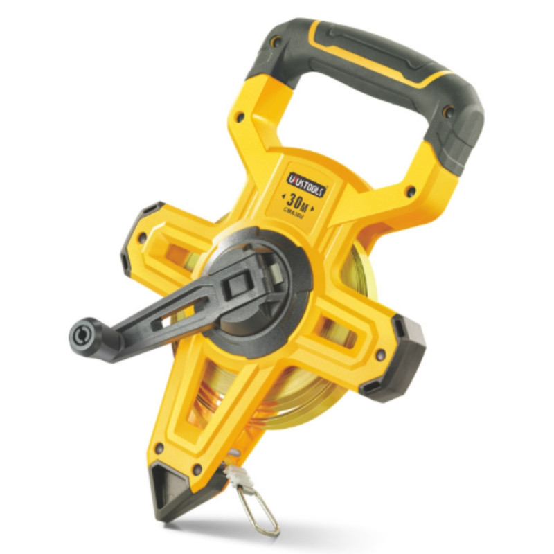 Decámetro metálico de 30 metros con estructura en cruz y mango superior para un agarre firme. La cinta de acero ofrece gran durabilidad y precisión en trabajos de replanteo, cierres perimetrales y mediciones de terreno, manteniendo un rebobinado rápido gracias a su relación 3:1.