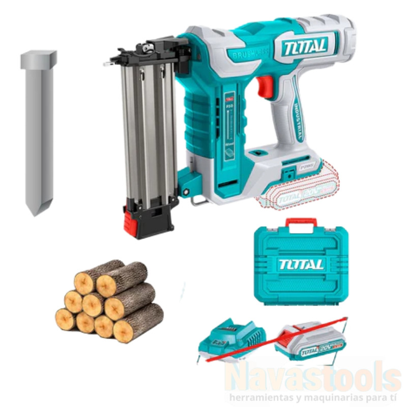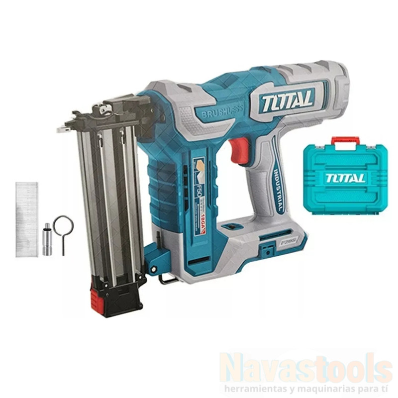 Clavadora profesional TOTAL 20V brushless para clavos 15-50mm. Velocidad 3 clavos/s. Incluye 1000 clavos de 50mm y accesorios. «Voltaje: 20V