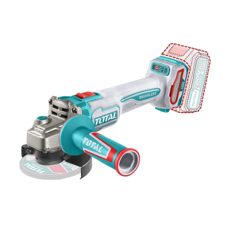 Esmeril angular industrial TOTAL 20V con potencia equivalente a 1200W. Motor brushless, tres velocidades y disco de 115mm. Para usuarios que ya poseen el sistema de baterías TOTAL. «Motor sin escobillas