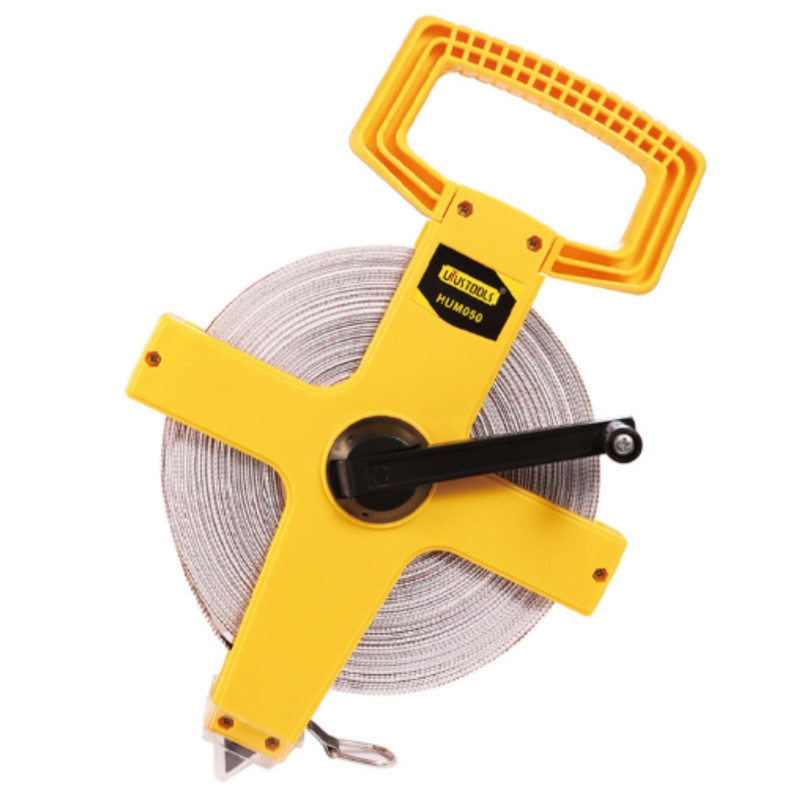Huincha larga de 50 metros en fibra de vidrio recubierta, diseñada para uso intensivo en faenas de construcción, nivelación y agrimensura. Su estructura abierta con manivela robusta facilita el enrollado, mientras que la cinta flexible soporta humedad y uso frecuente en exteriores.