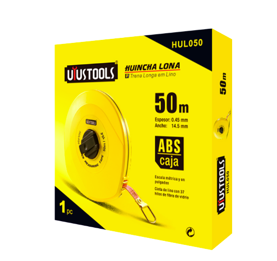 Cinta de medición de 50 metros fabricada en lona reforzada, ideal para mediciones largas en obras grandes y topografía. Su carcasa ABS y manivela de rebobinado rápido permiten un uso práctico y resistente en faenas intensivas, asegurando precisión y durabilidad. Largo 50 m; Material lona reforzada; Carcasa ABS; Ancho 14.5 mm; Espesor 0.45 mm