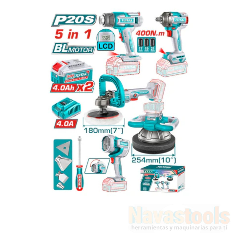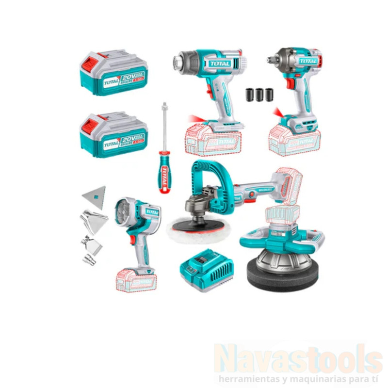 Kit 5 herramientas: pulidoras, llave, lámpara, pistola calor. Con 2 baterías 4.0Ah.