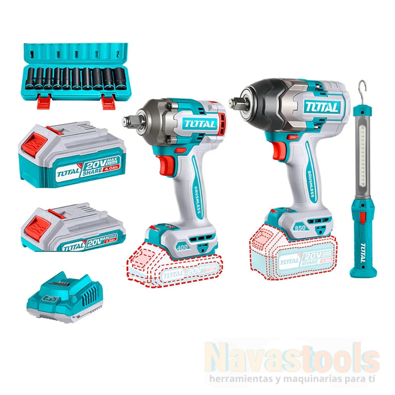 Kit profesional: llave impacto 850Nm + llave 400Nm + lámpara. Incluye juego de dados, 2 baterías y cargador. Ideal para taller mecánico y trabajos pesados. «Voltage:20V With 1pcs Cordless impact wrench(TIWLI20851) With 1pcs Cordless impact wrench(TIWLI20401) With 1Pcs work lamp(TWLI35261) Cordless impact wrench(TIWLI20851): Brushless motor Square drive:1/2″» No-load speed: 0-1600/0-2100/0-2400rpm Impact rate: 0-1500/0-1800/0-2200bpm Fastening torque: 850Nm Nut-Busting torque: 1000Nm Integrated LED work light Cordless impact wrench(TIWLI20401): Brushless motor Square drive: 1/2″» No-load speed: 0-1600/0-1900/0-2300rpm Impact rate: 0-2100/0-2500/0-2900bpm Fastening torque: 400Nm Nut-Busting torque: 550Nm Integrated LED work light Work lamp(TWLI35261): Using Li-polymer rechageable battery Lumens: Max:300±10% Low:75±10% LED power dissipation:3.5W Include: 10 Pcs 1/2″»DR. impact socket set(Material:Cr-MO,Size:10.12.13.14.15.17.19.21.22.24mm) 1 Pcs 4.0Ah battery(TFBLI20021) 1 Pcs 2.0Ah battery(TFBLI20011) 1 Pcs charge(TFCLI2001) Charge volts: 220-240V~50/60Hz Packed by color box»