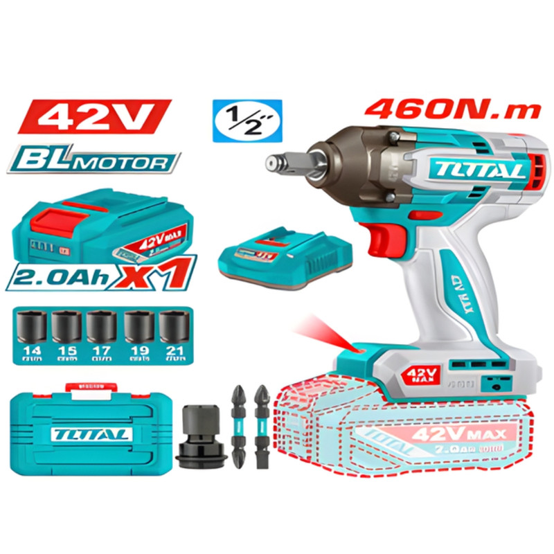 Llave de impacto profesional TOTAL 42V con 460Nm de torque, ideal para trabajos pesados en taller mecánico. Motor brushless, tres velocidades variables y torque de ruptura de 600Nm. Incluye 5 dados, adaptadores, batería y cargador. Perfecta para mecánica automotriz e industrial. «Motor sin escobillas
