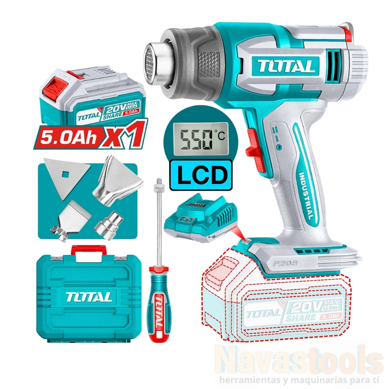 Pistola de calor TOTAL 20V con pantalla LCD y temperatura ajustable 30-550°C. Incluye 3 boquillas y raspador. Para usuarios del sistema TOTAL. «Voltaje: 20V