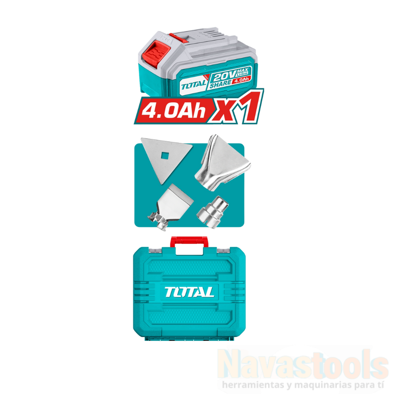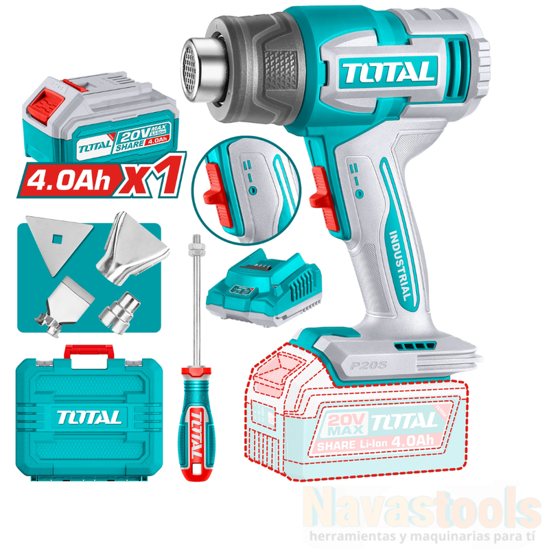 Pistola de calor TOTAL 20V profesional, kit completo con batería 4.0Ah, cargador, 3 boquillas, raspador y maletín. Múltiples aplicaciones en taller. «Voltaje: 20V