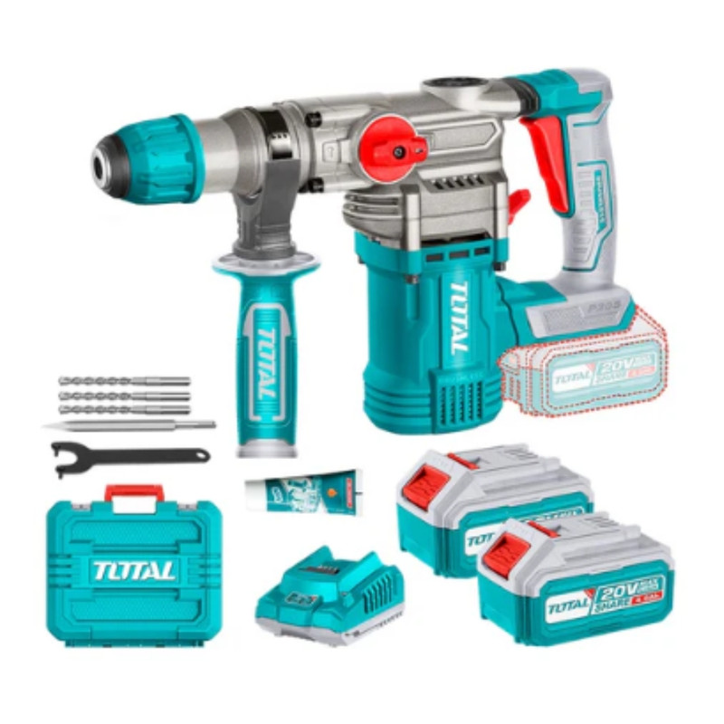 Rotomartillo de alta energía TOTAL 20V con 4.5J de impacto. Perfora hasta 28mm en hormigón. Kit profesional con 2 baterías, cargador, brocas, cincel y accesorios de mantenimiento. «Motor sin escobillas