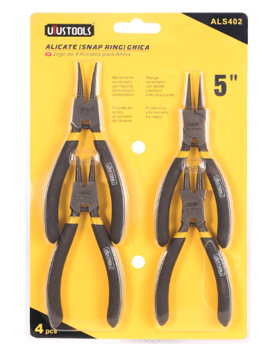 El set UYUSTOOLS ALS402 incluye 4 alicates de 5″ para anillos de retención internos y externos, rectos y curvos. Fabricados en acero al carbono endurecido para un rendimiento duradero, estos alicates permiten retirar e instalar seguros con precisión. Sus mangos ergonómicos proporcionan comodidad y control, ideales para mecánicos, técnicos y trabajos de precisión.