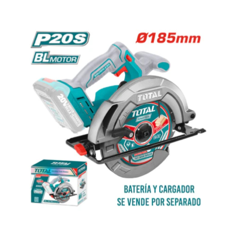 Sierra circular TOTAL 20V brushless con hoja de 185mm. Kit completo con batería 5.0Ah, cargador, hoja y llave. Máximo rendimiento en carpintería y construcción. «Motor sin escobillas