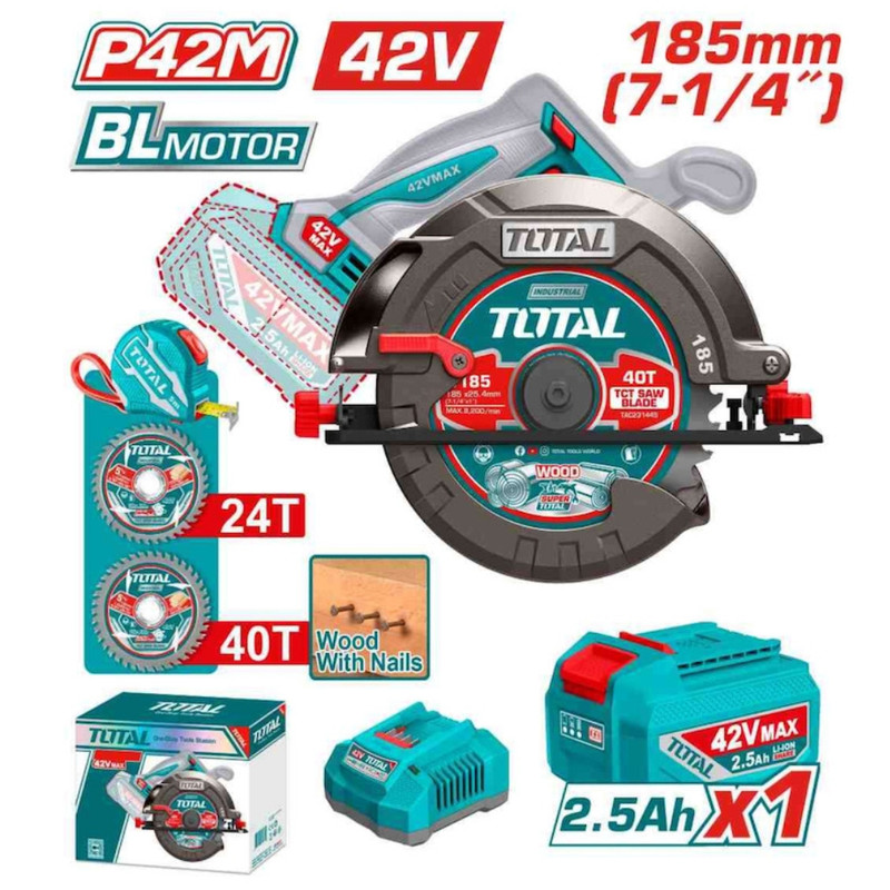 Sierra circular profesional TOTAL 42V con hoja de 185mm (7-1/4″). Motor brushless, velocidad 4800 RPM, cortes a 45° (45mm) y 90° (65mm). Incluye 2 hojas de sierra, cinta métrica, batería 2.5Ah y cargador. Ideal para carpintería, construcción y trabajos en madera. «Brushless motor