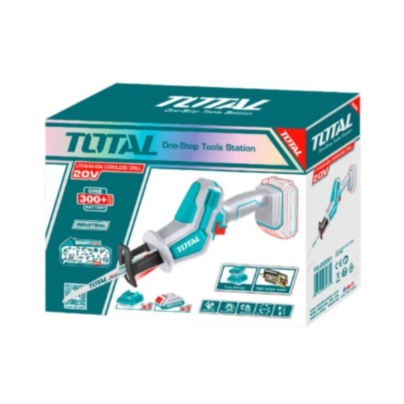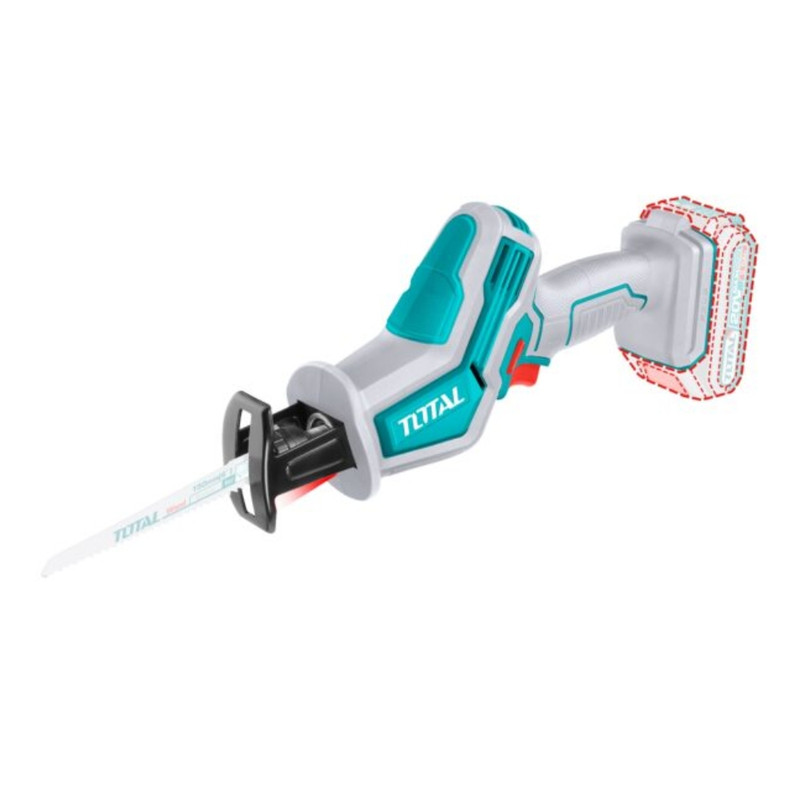 Sierra sable TOTAL 20V con velocidad variable hasta 3200 RPM. Corta metal (8mm) y madera (65mm). Luz integrada. Sin batería ni cargador. «Voltaje: 20V
