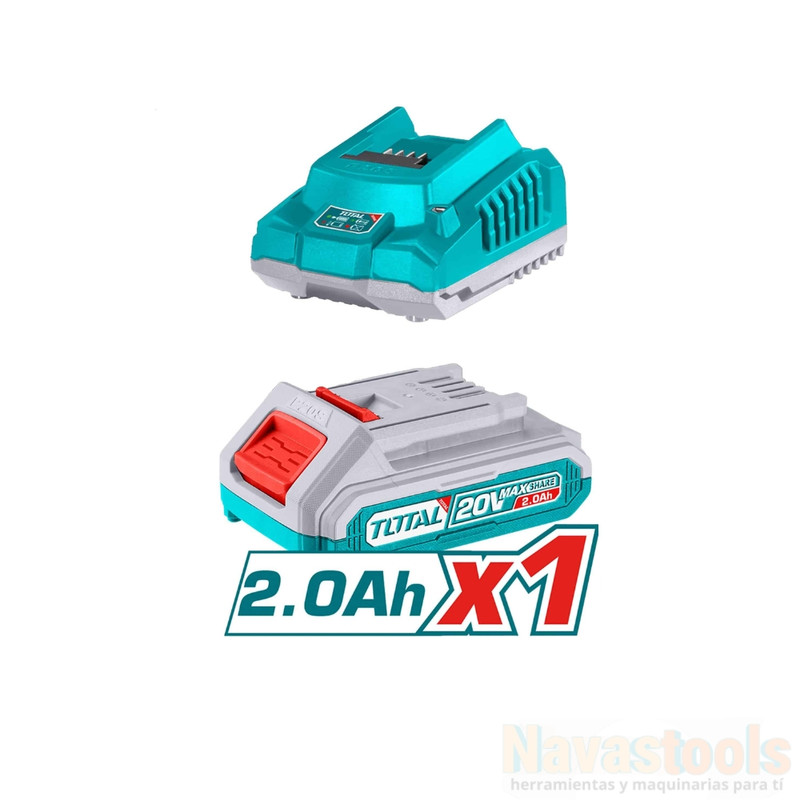 TOTAL 20V con flujo de aire de 2,7 m³/min. Dos velocidades y gatillo
