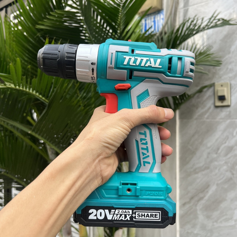 Taladro inalámbrico TOTAL 20V ideal para bricolaje y trabajos profesionales. Dos velocidades, 45Nm de torque y mandril de 10mm. Incluye 2 baterías 2.0Ah, cargador rápido y broca Cr-V. Luz LED e indicador de batería para mayor comodidad. «Voltaje:20V